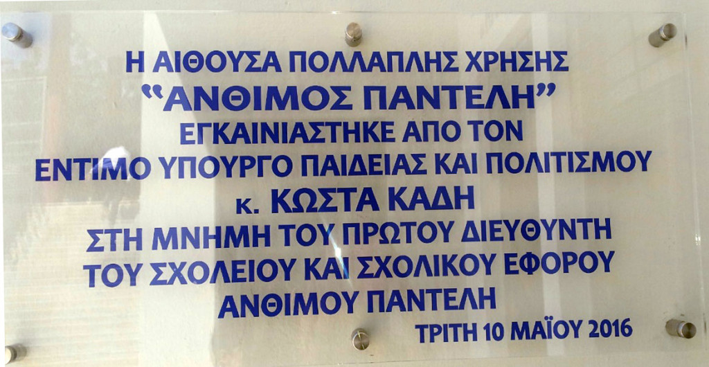 Η Εφορεία Ελληνικών Εκπαιδευτηρίων Λεμεσού εις ένδειξη τιμής και εκτίμησης προς τον Σχολικό Έφορο Άνθιμο Παντελή υλοποίησε σήμερα την απόφασή της για ονομασία της Αίθουσας Πολλαπλής Χρήσης στο όνομα του πρώτου Διευθυντή του Γυμνασίου Αγίας Φυλάξεως και Σχολικού Εφόρου ΑΝΘΙΜΟΣ ΠΑΝΤΕΛΗ. Ευχαριστούμε για την παρουσία τους τον έντιμο Υπουργό Παιδείας και Πολιτισμού Δρ. Κώστα Καδή, τον πανιερώτατο Μητροπολίτη κ. Αθανάσιο και όλους τους εκλεκτούς προσκεκλημένους.