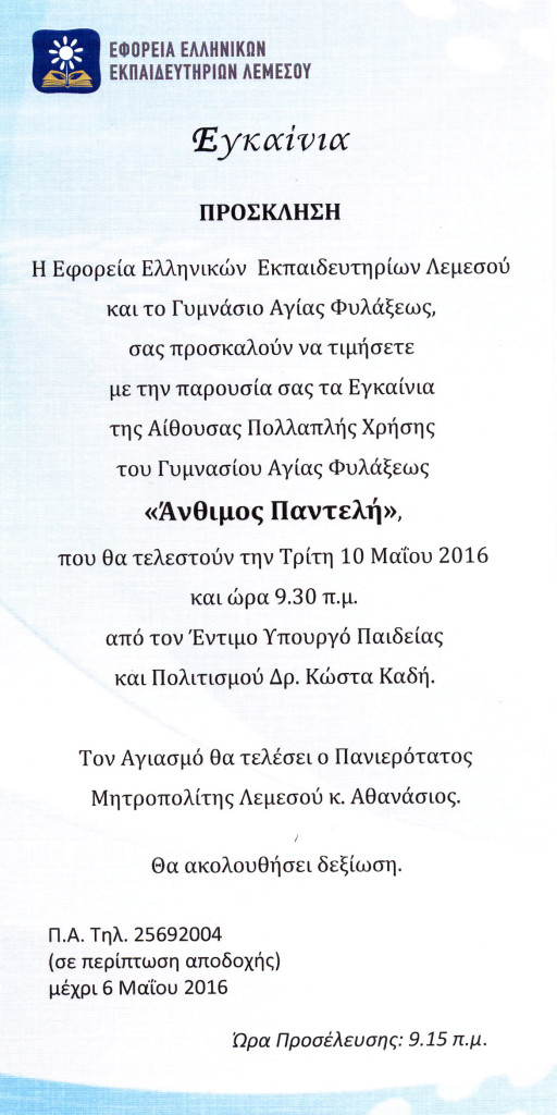 Εγκαίνια της Αίθουσας Πολλαπλής Χρήσης του Γυμνασίου Αγίας Φυλάξεως "Άνθιμος Παντελή"